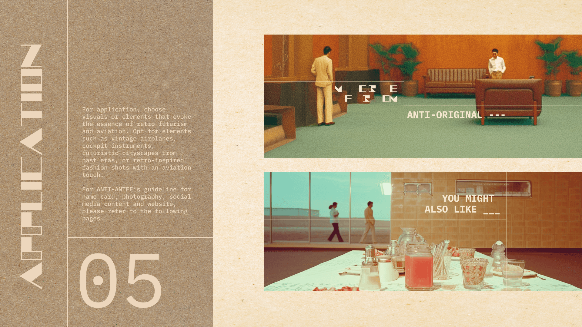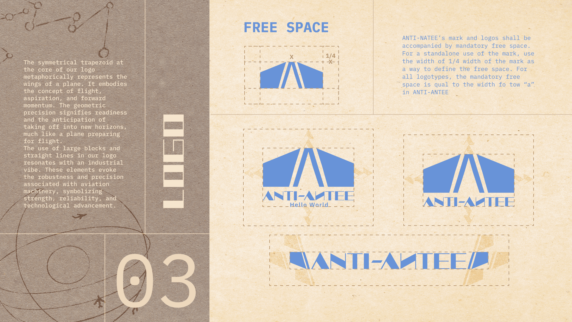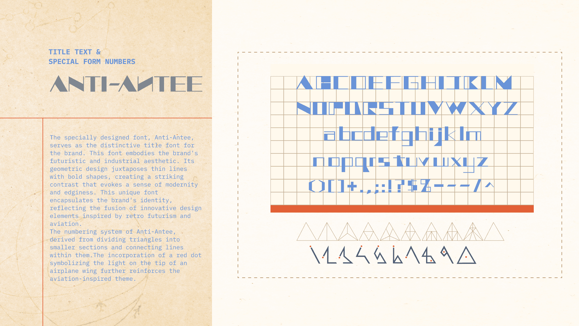 The specially designed font, Anti-Antee, serves as the distinctive title font for the brand. This font embodies the brand's futuristic and industrial aesthetic. Its geometric design juxtaposes thin lines with bold shapes, creating a striking contrast that evokes a sense of modernity and edginess. This unique font encapsulates the brand's identity, reflecting the fusion of innovative design elements inspired by retro futurism and aviation.