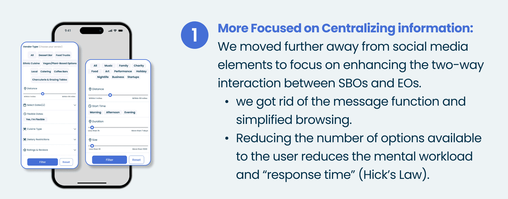 Small business owners (SBO) interface tailored to their event search needs. With an in-depth filter, SBOs perform a targeted search that helps narrow down their options.