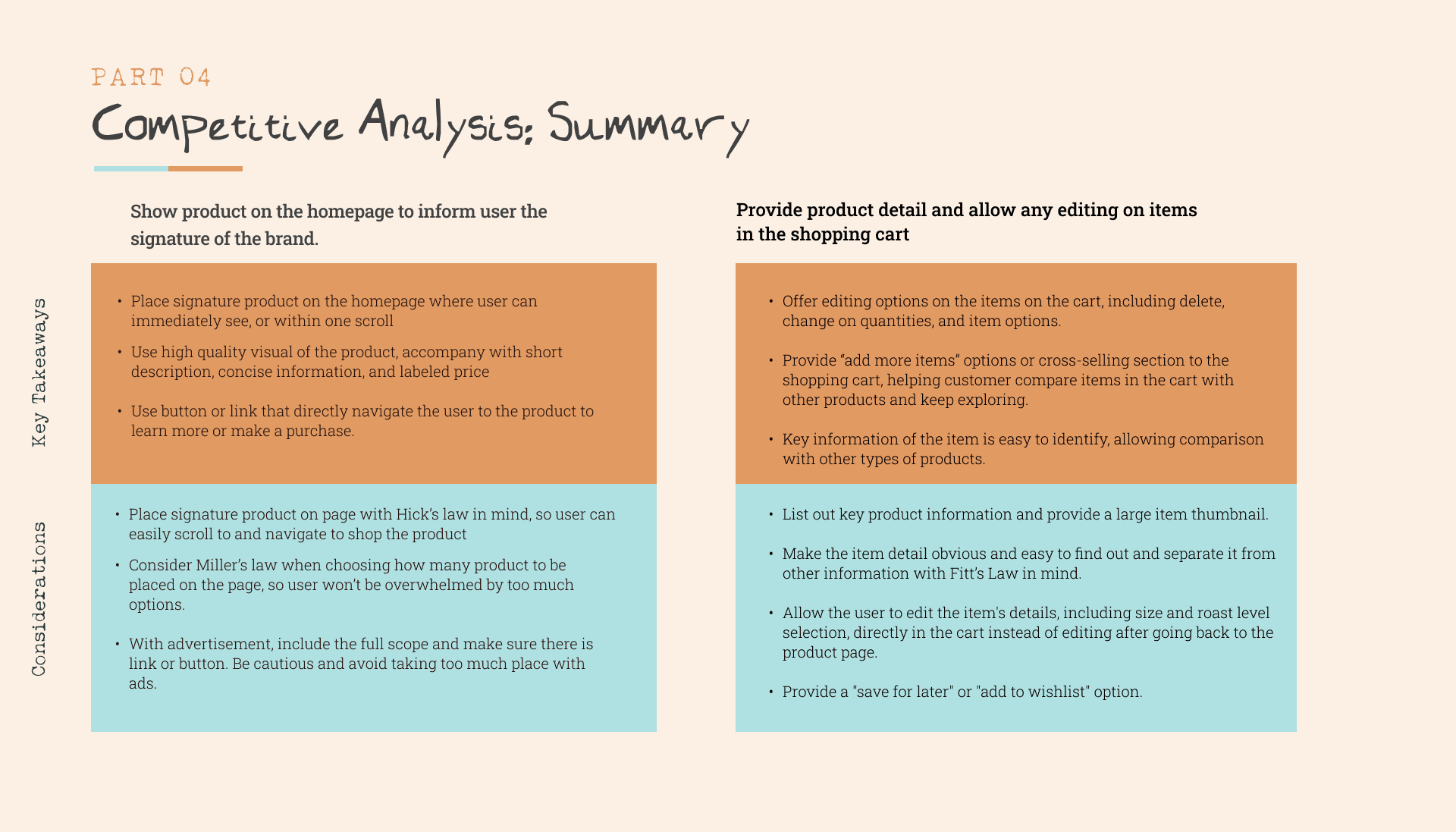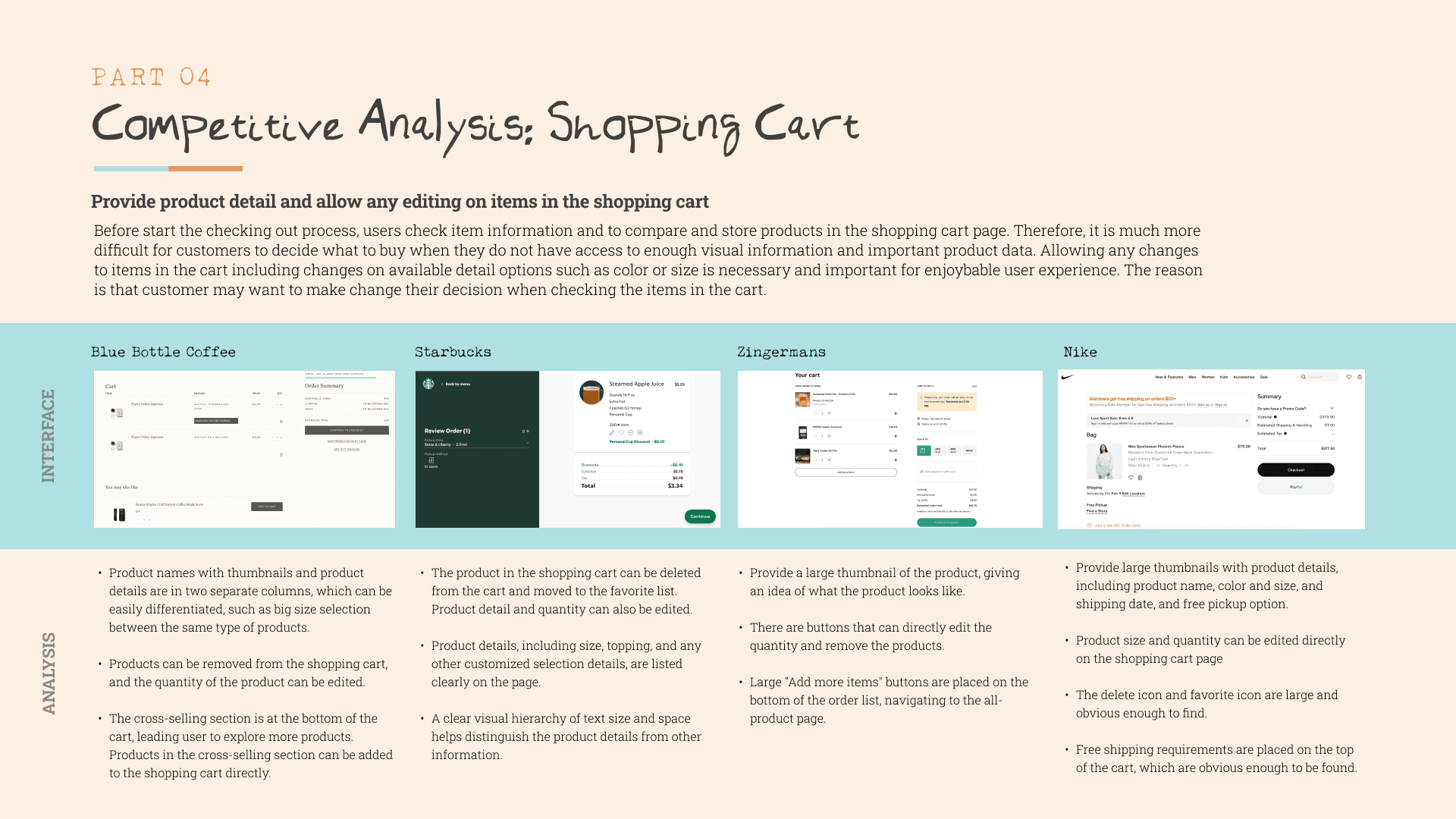 We took a deeper dive into the HOME PAGE and SHOPPING CART of some of our competitors to analyze their strengths and weaknesses.